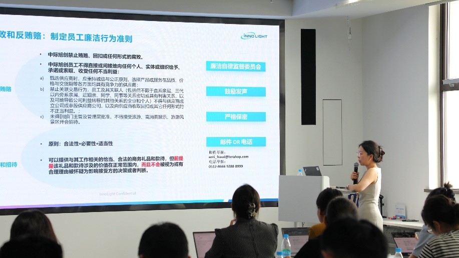During the compliance session, Zhongji InnoLight’s Compliance Director underscored that the failures in labor rights protection, inadequate environmental management, or violations in trade activities within the supply chain could not only result in hefty penalties and restricted market access, but also erode long-term brand value. To address these risks, Zhongji InnoLight has established a full-cycle compliance protection system for supplier partnerships. This includes a proactive ESG screening mechanism to mitigate risks at the source, the setting of science-based carbon targets to drive green transformation, and the creation of transparent integrity reporting channels to strengthen ongoing monitoring and evaluation. In cases of supplier violations, corrective actions will be required, and cooperation may be terminated if necessary. Furthermore, Zhongji InnoLight has embedded trade compliance “red lines” into supplier agreements, requiring partners to jointly commit to prohibiting forced labor, commercial bribery, and the circulation of illicit materials—thereby building a community of responsibility to safeguard against compliance risks.